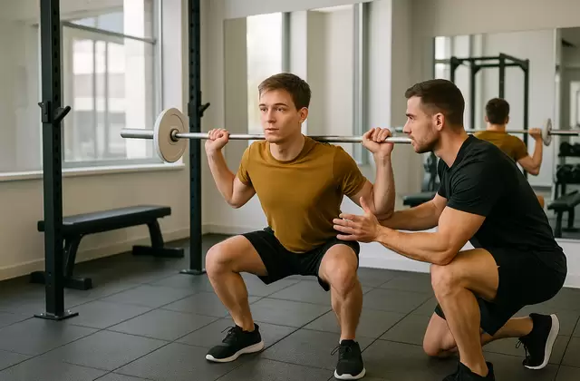 При его выполнении новички часто допускаюь ошибки. Самые распространенные — отрыв пяток от пола и сведение коленей внутрь. Чрезмерный наклон корпуса вперед или округление поясницы также нарушают технику. Если упражнение не дается сразу, сначала используйте приседания с опорой о стену. Чтобы добиться прогрессии, постепенно переходите к приседаниям на ящик высотой 40-50 см. Следующий этап — приседания с паузой 2 секунды в нижней точке. После освоения добавляем гантели 4-6 кг у плеч.